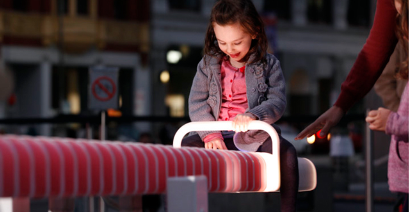 En el cuerpo del balancín hay luces de LED que reaccionan al movimiento y se iluminan según tus interacciones. La instalación crea entornos de luz para las personas que estaban subidas. Su diseño permite que un lugar como una plaza o un parque, deje de ser una vía paso y se convierta en un sitio en que puedan pasar cosas y ocurran dinámicas sociales espontáneas.
